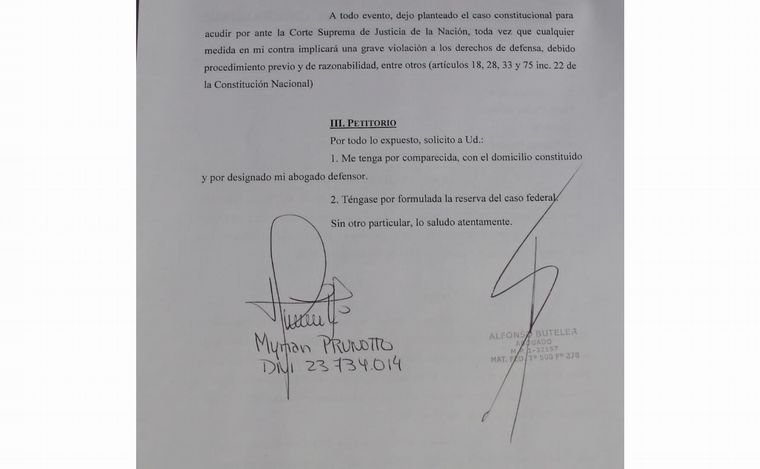 Entre otros conceptos, la presentación que Prunotto no pudo presentar dice textualmente: "…Dejo planteado el caso constitucional para acudir ante la Corte Suprema de Justicia de la Nación, toda vez que cualquier medida en mi contra implicará una grave violación a los derechos de defensa, debido procedimiento previo y de razonabilidad, entre otros (artículos 18, 28, 33 y 75 inc. 22 de la Constitución Nacional)".