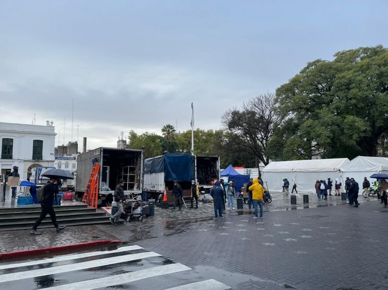 En total hay cinco camiones de exteriores con elementos para filmar: grupos electrógenos, cortinas, gazebos, y escaleras, entre otras herramientas y hay más de 100 personas trabajando en la 27 de Abril para la filmación de "Granizo", la nueva película de Netflix con Guillermo Francella.