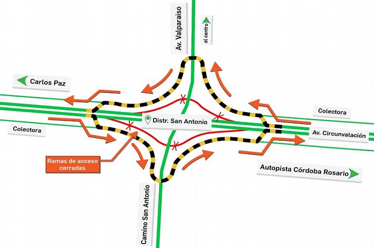La empresa Caminos de las Sierras informó que debido a los trabajos de readecuación de los distribuidores San Carlos y San Antonio, desde el miércoles se implementarán redireccionamientos en la circulación del tránsito en el sector.