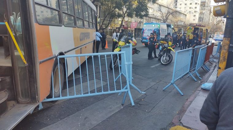 Un colectivo de la empresa Coniferal giró desde calle Tucumán hacia Colón y chocó unas vallas que golpearon a una persona que cruzaba la Avenida.