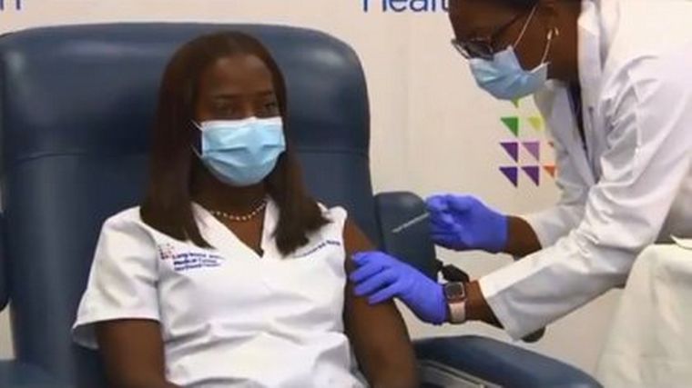 Vestida con su ambo de pantalón azul y remera blanca y sentada en una silla, la enfermera afroamericana Sandra Lindsay recibió la primera dosis de la vacuna de Pfizer-BioNTech, que le fue aplicada en el hombro izquierdo por una doctora vestida con guardapolvo blanco.