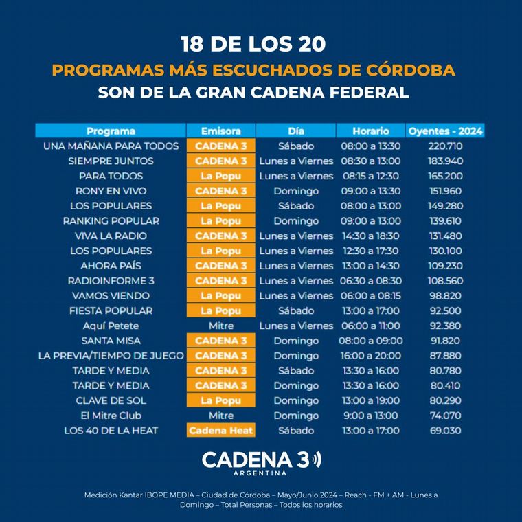 18 de los 20 programas más escuchados son de Cadena 3, La Popu y Heat