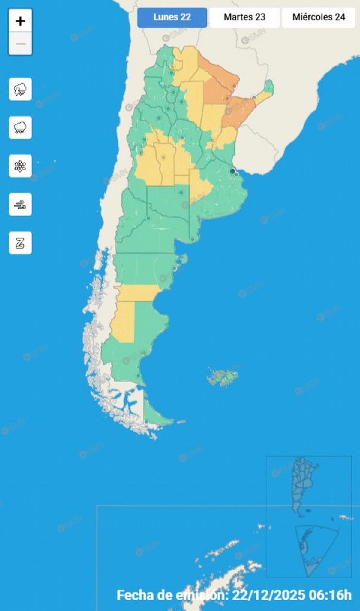 El aviso, que en algunas zonas sube a alerta naranja, es para zonas de la provincia de Buenos Aires, Chaco, Córdoba, Corrientes, Entre Ríos, Formosa, Jujuy, La Pampa, La Rioja, Mendoza, Misiones, Salta, San Juan, San Luis, Santa Fe y Santiago del Estero.