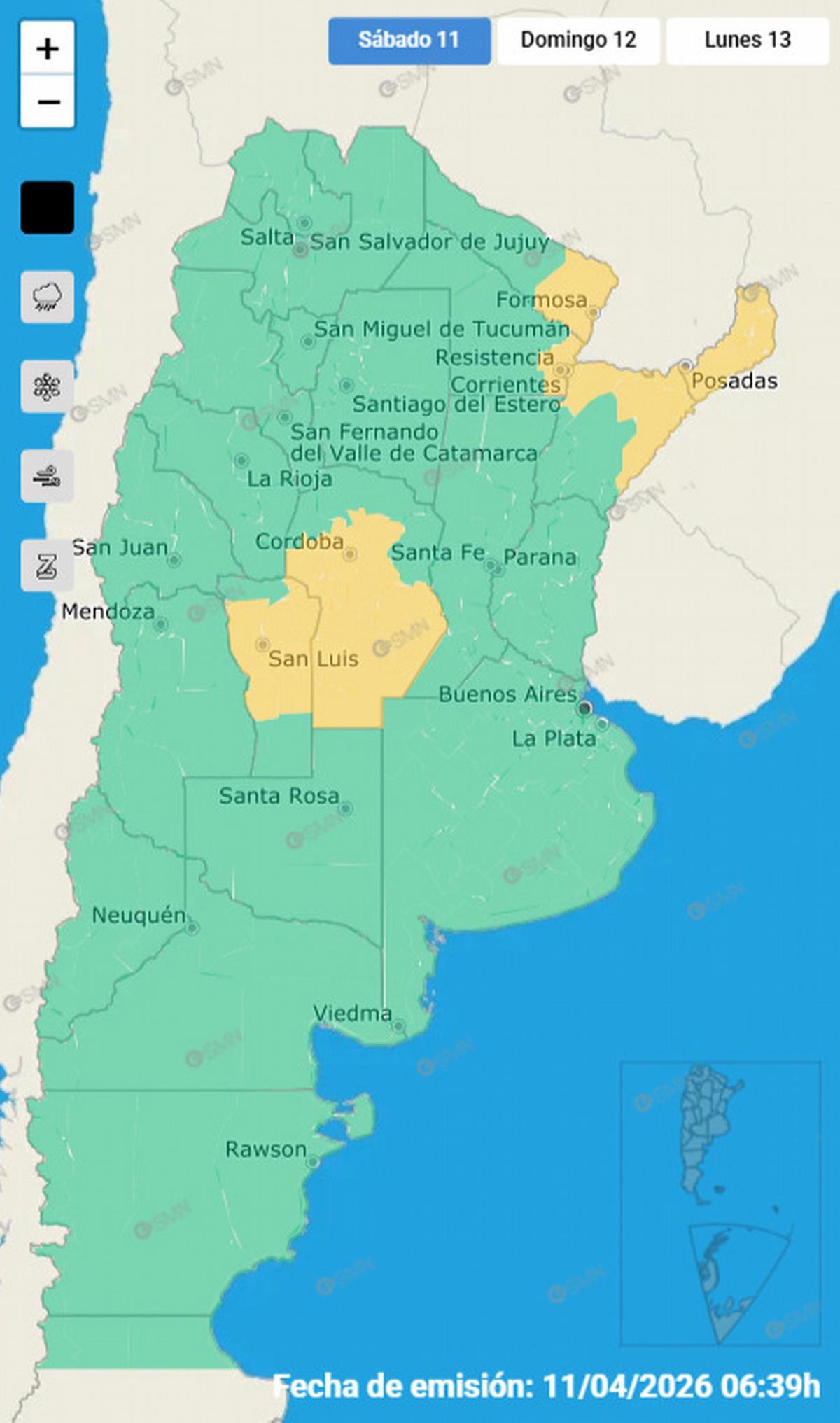 El Servicio Meteorológico Nacional (SMN) emitió este sábado una alerta amarilla por tormentas que abarca sectores de las provincias de Córdoba, San Luis, Formosa, Chaco, Corrientes y Misiones, donde se prevén fenómenos con capacidad de daño y posibles interrupciones momentáneas de actividades cotidianas.