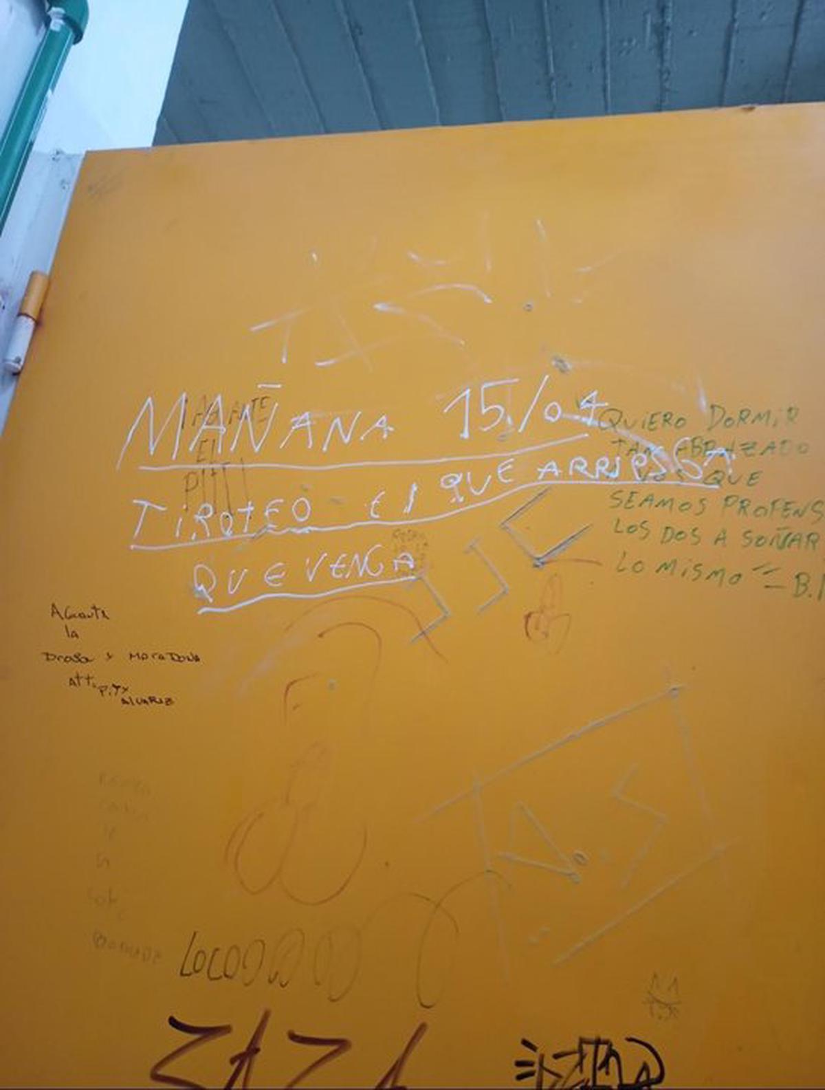 En la pared de fondo amarillo se puede leer: "Mañana 15/04 tiroteo, el que arriesga que venga".