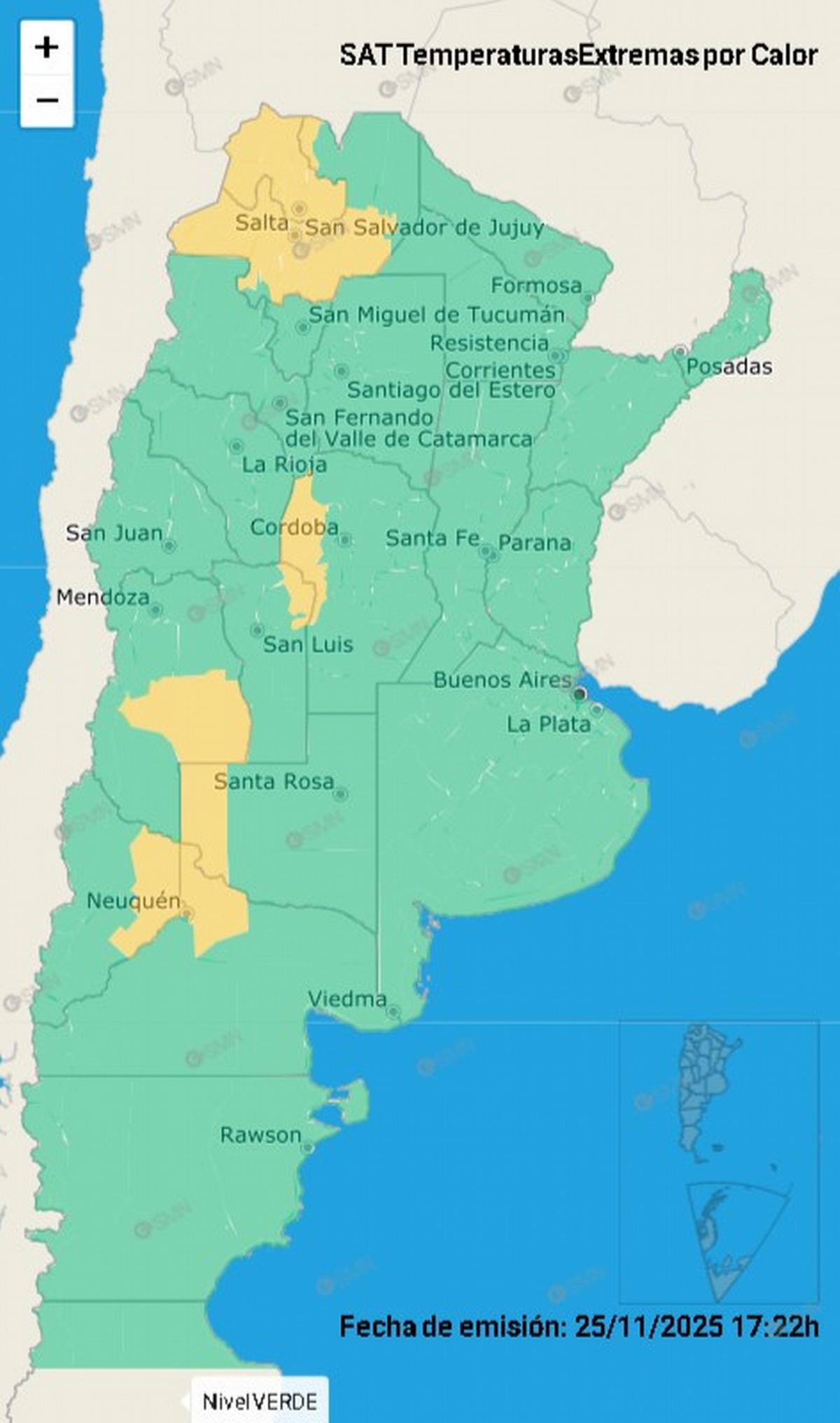 ¿Qué provincias tienen alertas por altas temperaturas? Las alertas por altas temperaturas son para Neuquén, Río Negro, La Pampa, Mendoza, Córdoba, Jujuy y Salta.