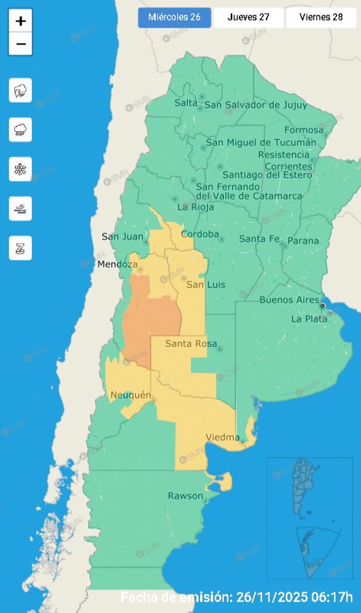 ¿Para qué zonas son las alertas? Las alertas son para Chubut, Río Negro, Neuquén, Mendoza, La Pampa, San Luis, San Juan y Santa Cruz.
