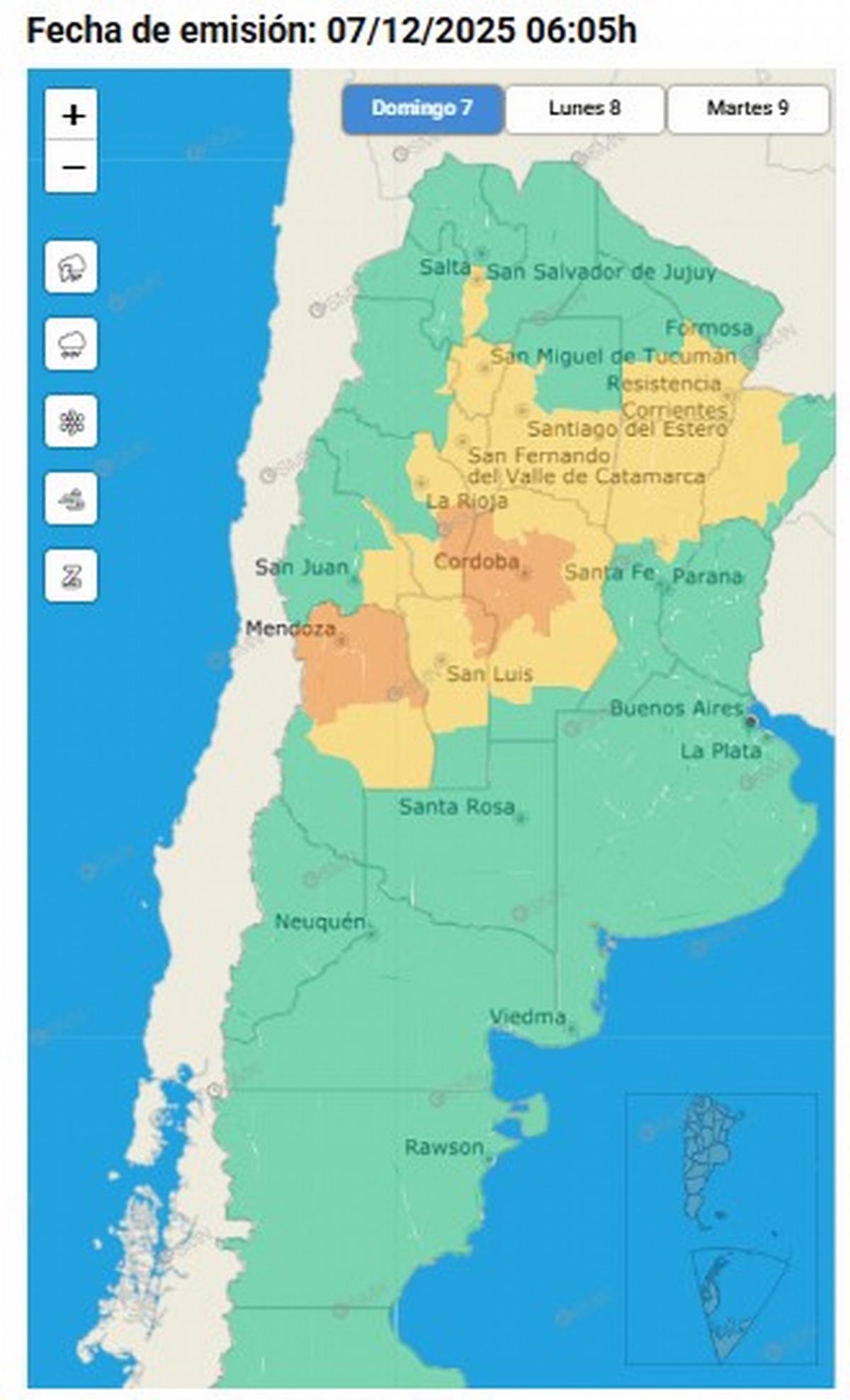 Las zonas comprendidas por este nivel de aviso incluyen a sectores de San Juan, el norte de Santa Fe, Catamarca, Santiago del Estero, Tucumán, Chaco, Corrientes y una franja de Salta.
