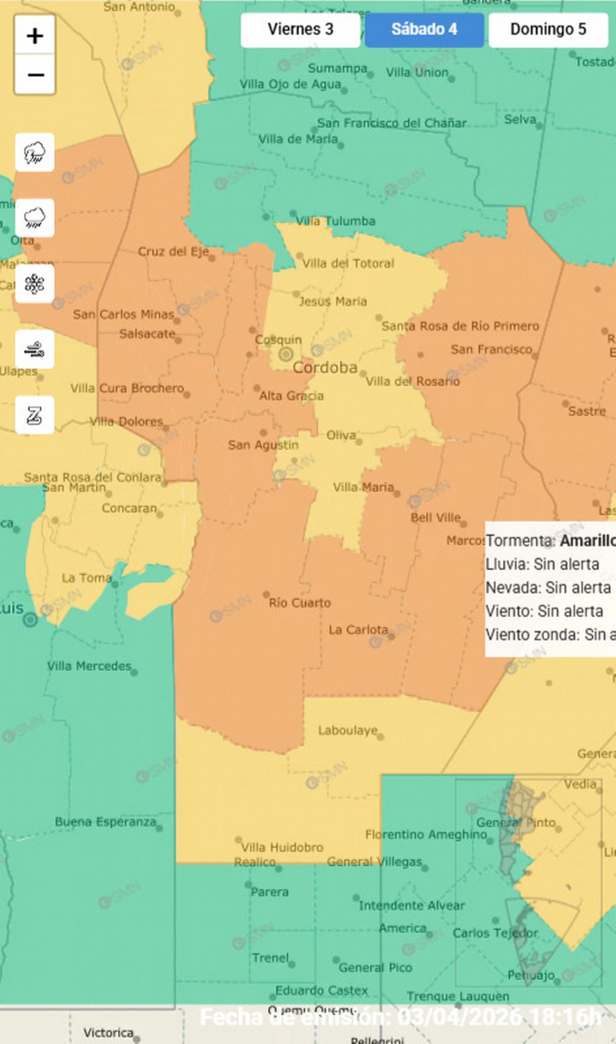 El SMN emitió una alerta amarilla por tormentas en gran parte de la provincia. Se esperan lluvias abundantes, ráfagas y posible caída de granizo durante todo el fin de semana largo.