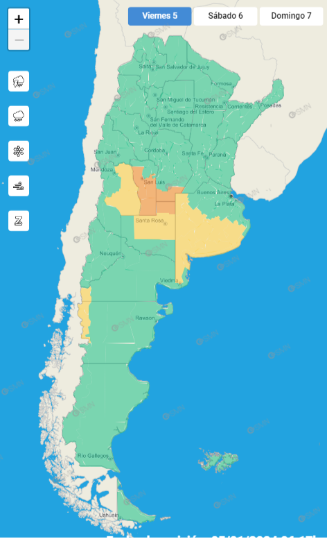 En tanto, se encuentran bajo alerta amarillo el centro y sur de la provincia de Buenos Aires, centro de La Pampa, este de Mendoza, y el oeste de Río Negro y Chubut.