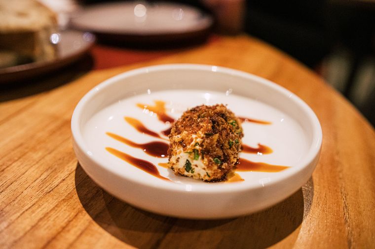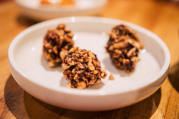 Trufa de queso de cabra, arrope de chañar y pangrattato