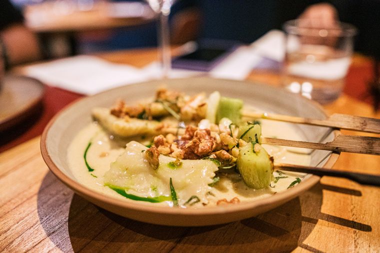 Doppio ravioli de calabaza asada y pollo, bagna cauda, brócoli, puerro, verdeo, hierbas alimonadas y nuez