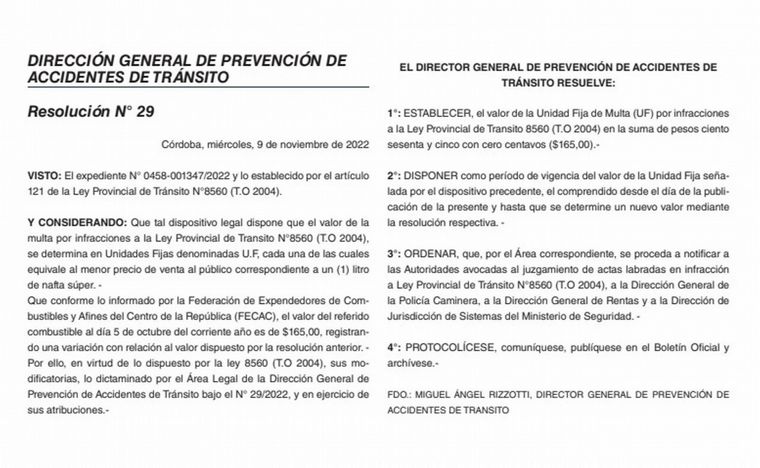 Este jueves actualizaron la Unidad Fija de multas de tránsito en Córdoba tras el aumento en el los valores del combustible y la resolución se publicó en el Boletín Oficial.