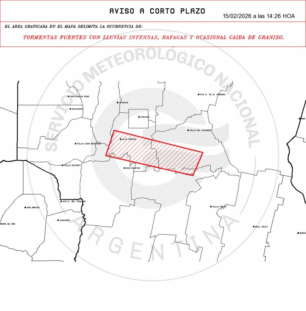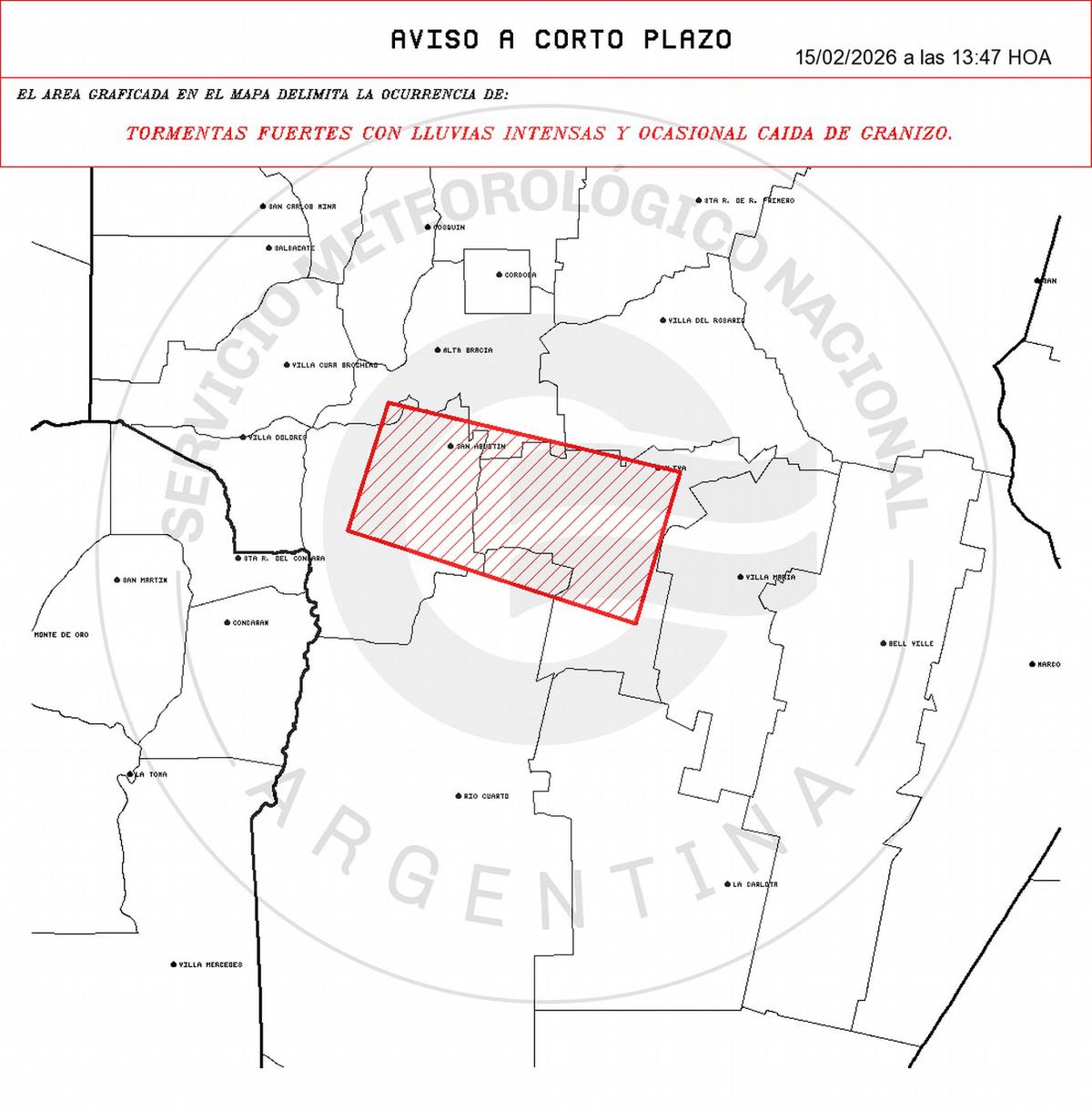 Según el organismo, el alerta alcanza a sectores de los departamentos Calamuchita, Río Cuarto, Río Segundo, Santa María y Tercero Arriba. La advertencia tiene una validez de dos horas desde el momento de su emisión y los fenómenos fueron detectados a través de radares meteorológicos.