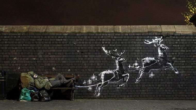El reconocido artista callejero Banksy sorprendió con un nuevo mural en el que denuncia la problemática de personas que viven en situación de calle en Reino Unido durante las fiestas navideñas, con una pintura que muestra a dos renos de Papá Noel intentando arrastrar hacia al cielo a un hombre que duerme en un banco de la vereda.