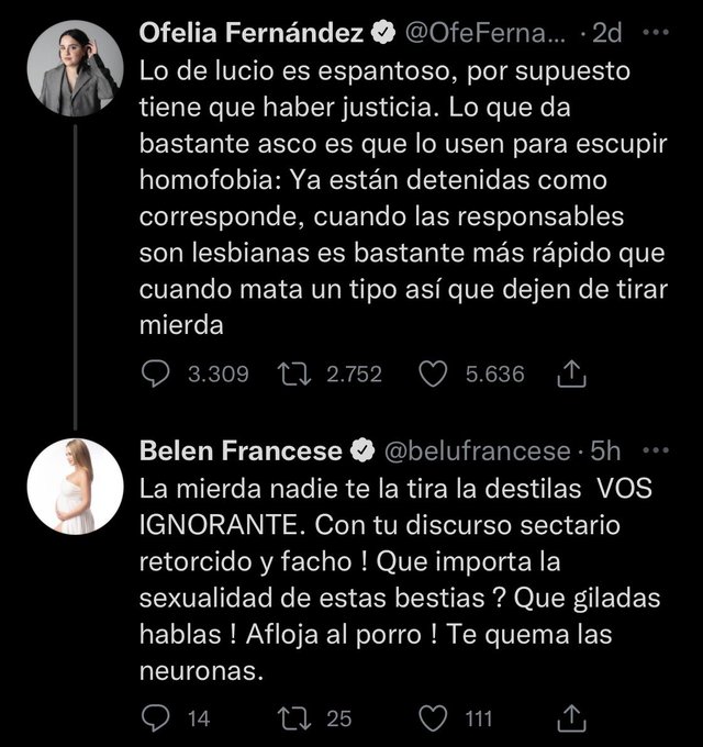 Esta ves fue entre Ofelia Fernández y Belén Francese en donde la actriz no se quedó callada por el tweet de la legisladora: “Lo de Lucio es espantoso, por supuesto tiene que haber justicia. Lo que da bastante asco es que lo usen para escupir homofobia: ya están detenidas como corresponde, cuando las responsables son lesbianas es bastante más rápido que cuando mata un tipo así que dejen de tirar mierda”, escribió Ofelia.
