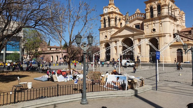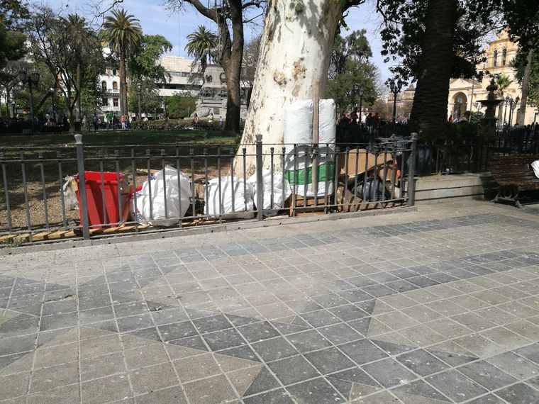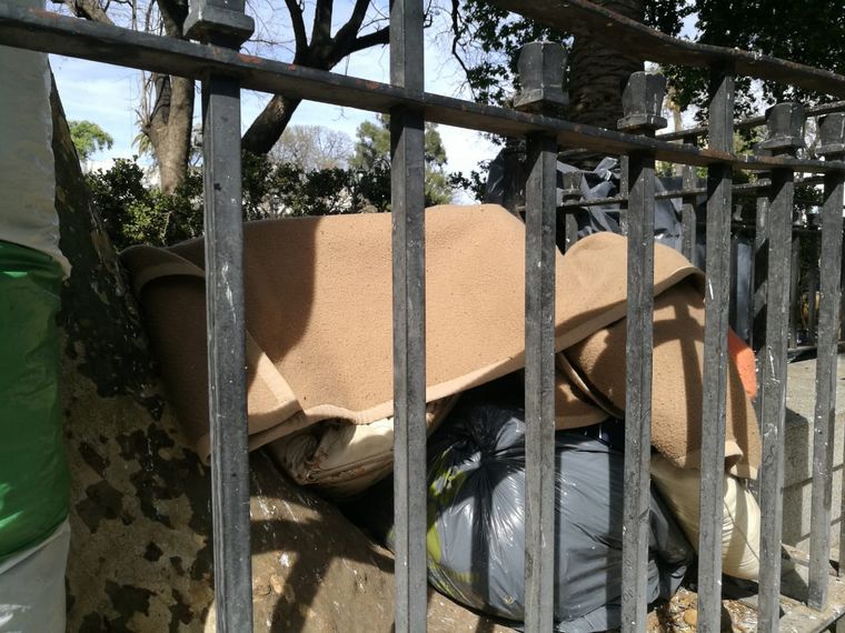 En la explanada en frente de la Catedral, hay bolsas y cartones que los propios linyeras dejan a la vista de todo el mundo durante las horas del día.