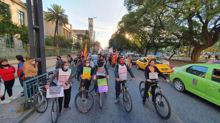 Docentes y padres se congregaron en plaza Colón y marcharon hasta el Centro Cívico. Exigen vacunación al personal y volver a la virtualidad hasta que baje la curva de contagios en la provincia.