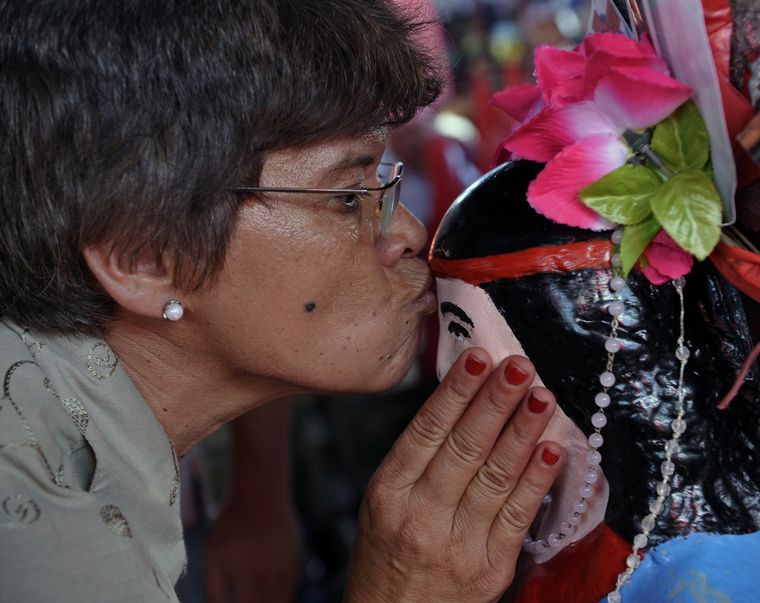 "Vinimos hoy porque no pudimos ir a Corrientes como lo hacemos hace diez años, siempre pido por mi familia y por mi hija; él me ayudó cuando mi nena nació con el cordón umbilical enroscado en el cuello y le afectó los pulmones y la cabeza", contó a Télam Marisol Oviedo, de 33 años, quien homenajeó junto a la niña de 8 años al Gauchito con cigarrillos y dinero.
