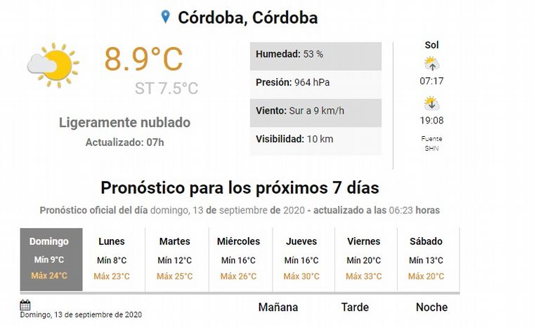 El Servicio Meteorológico Nacional (SMN) pronosticó una jornada agradable para este domingo en la provincia de Córdoba, día habilitado para mantener reuniones familiares.