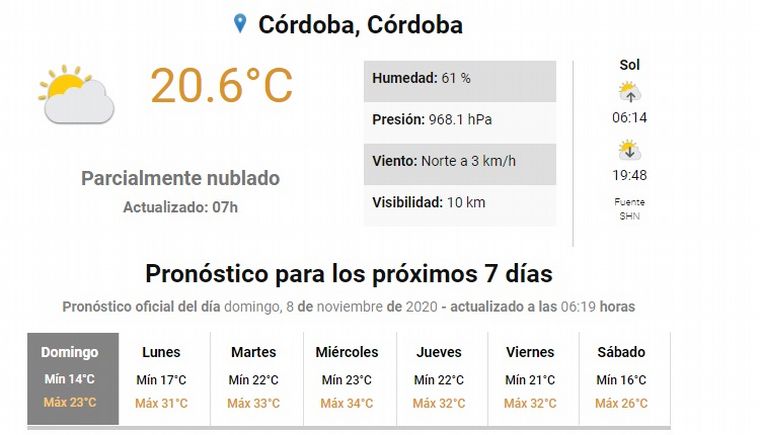 El Servicio Meteorológico Nacional (SMN) también pronostica para este domingo vientos "moderados a débiles del noreste, con descenso de temperatura". La máxima prevista es de 26ºC.