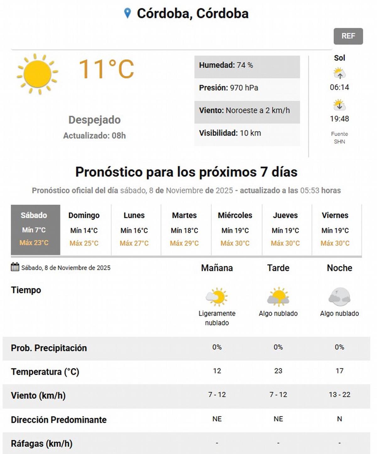 Luego de las intensas lluvias registradas el viernes en distintos puntos del territorio provincial, Córdoba amaneció este sábado con cielo despejado y una temperatura de 11 grados, según datos del Servicio Meteorológico Nacional (SMN).