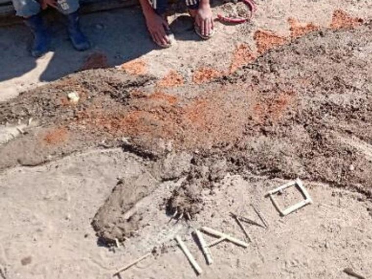 Usó tierra, mezclada con agua para delimitar el cuerpo del animal, unos palitos en reemplazo de las garras y los dientes, el color estuvo presente de la mano del polvo de ladrillo que sirvió para las espinas del lomo.