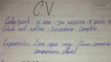 Había ido a una panadería. La empleada lo invitó a dejar su currículum. Como no tenía plata para imprimir, lo escribió de puño y letra. La chica lo viralizó y hoy tiene empleo en una vidriería.