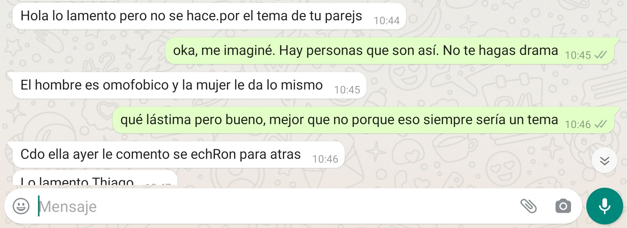 En la citada captura de pantalla se ve que la persona allegada a Leis le señaló: "Lo lamento, pero no se hace por el tema de tu pareja. El hombre es homofóbico y a la mujer le da lo mismo; cuando ella le comentó, se echaron para atrás".