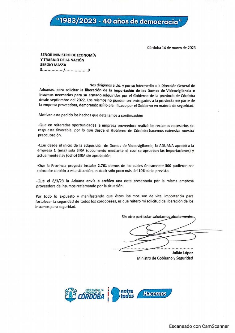 El Gobierno provincial hizo extensivo este requerimiento, basado en la necesidad de mejorar los sistemas de seguridad en el territorio cordobés.
