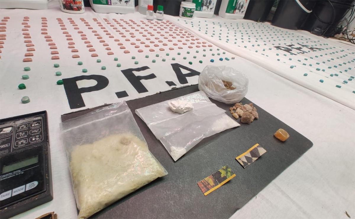 En el lugar se encontraron seis plantas florecidas y otras siete sin florecer, cogollos, 654 pastillas de éxtasis, cocaína, cristal, ketamina líquida, cuatro celulares, dos balanzas de precisión y 232.500 pesos en efectivo. Además, había elementos de cultivo y fraccionamiento.