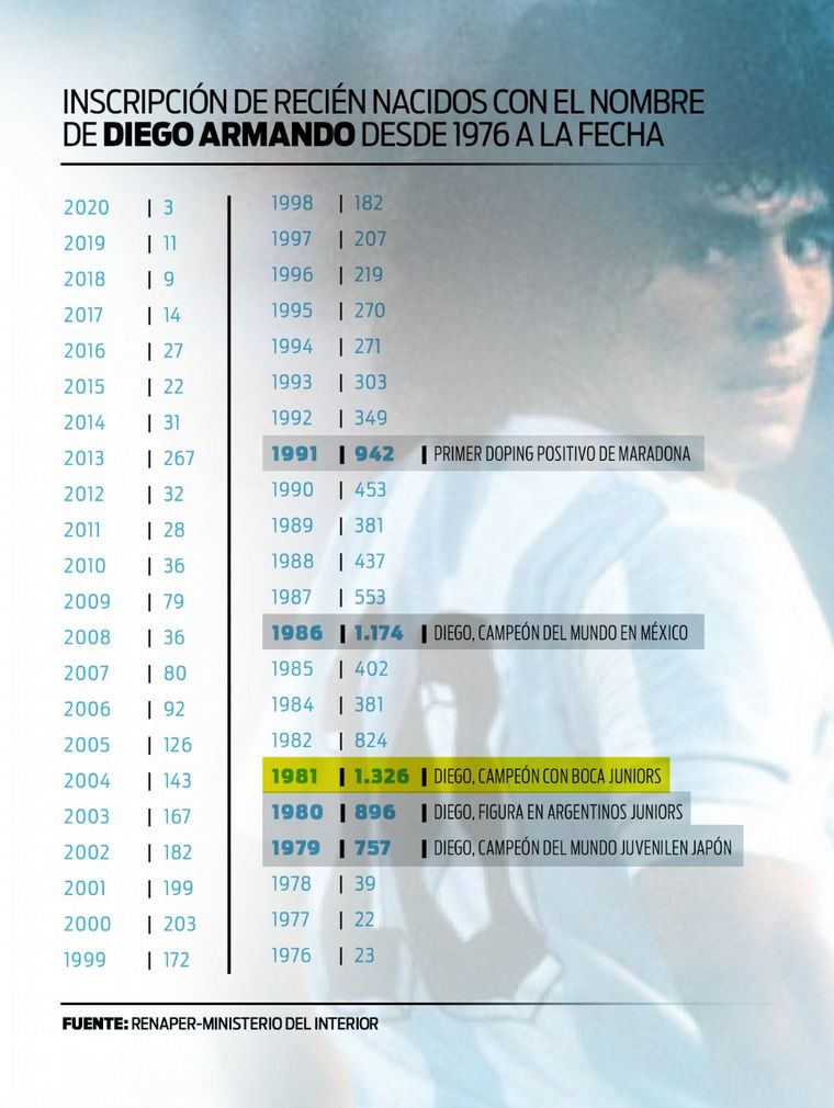 Las inscripciones de recién nacidos con el nombre Diego Armando suman 12.370 desde 1976 a la fecha, según el Registro Nacional de las Personas (RENAPER).