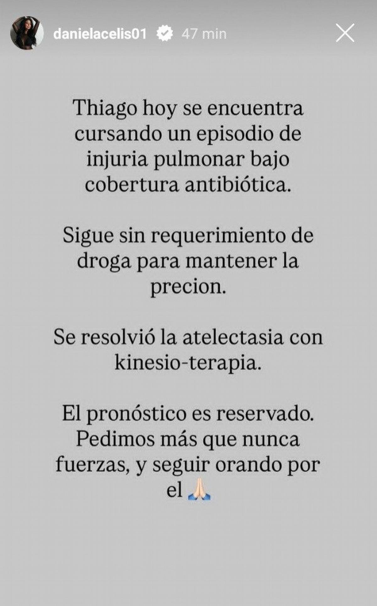 La expareja de Thiago también explicó que los médicos habían detectado atelectasia, una complicación pulmonar que requiere un seguimiento constante. "Al día de hoy Thiago continúa sin requerimientos de drogas para mantener su presión. Continúa con respirador, sedado, en terapia intensiva, sigue con antibióticos", comunicó en otra historia.