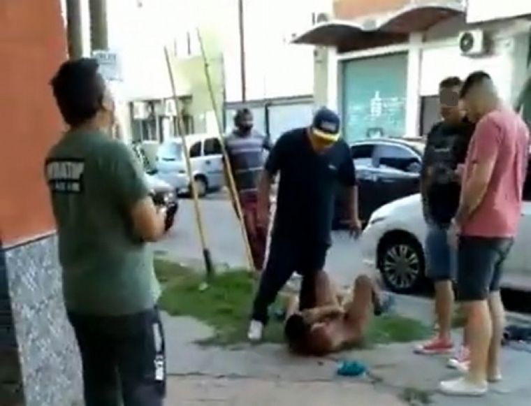 Alertados por los pedidos de auxilio de la víctima, los vecinos salieron a la calle a perseguir a los ladrones y lograron atrapar a uno de los jóvenes sospechosos, a quien arrojaron al suelo, golpearon, patearon en la cabeza y desnudaron.