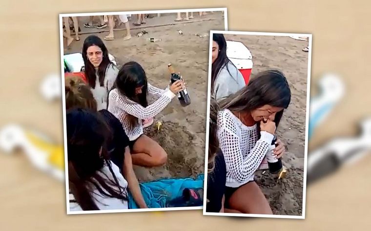 El insólito video fue grabado el fin de semana en una playa de la costa argentina. En el mismo se observa a una muchacha descorchar la botella golpeando la base contra la arena.