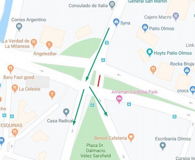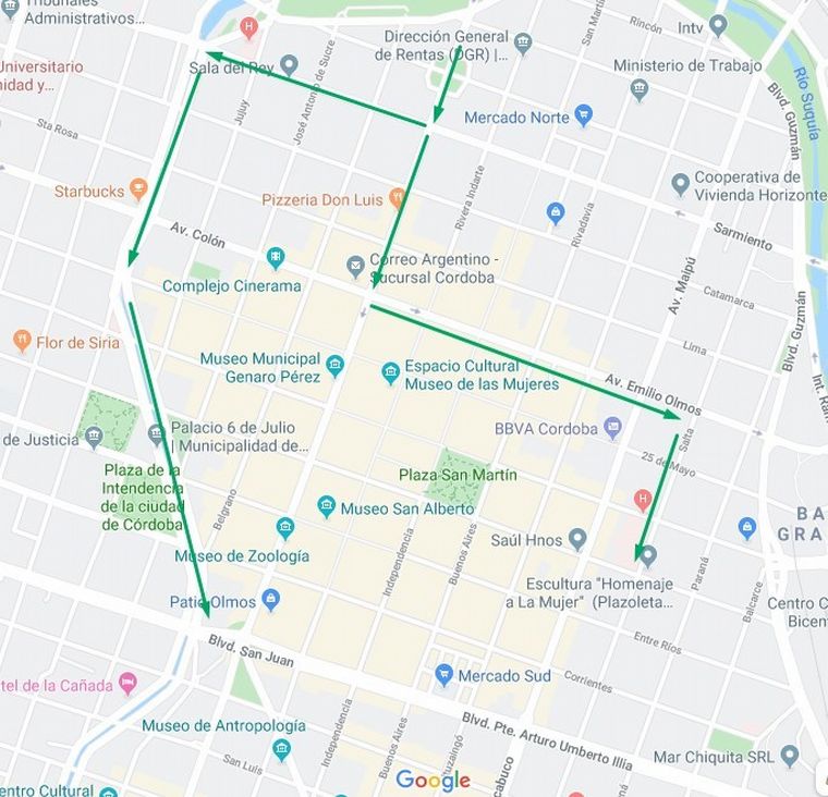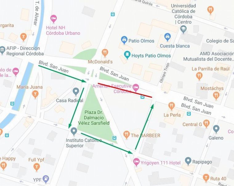 Los vehículos particulares desvían por Vélez Sarsfield, luego Montevideo y retoman San Juan por Obispo Trejo.