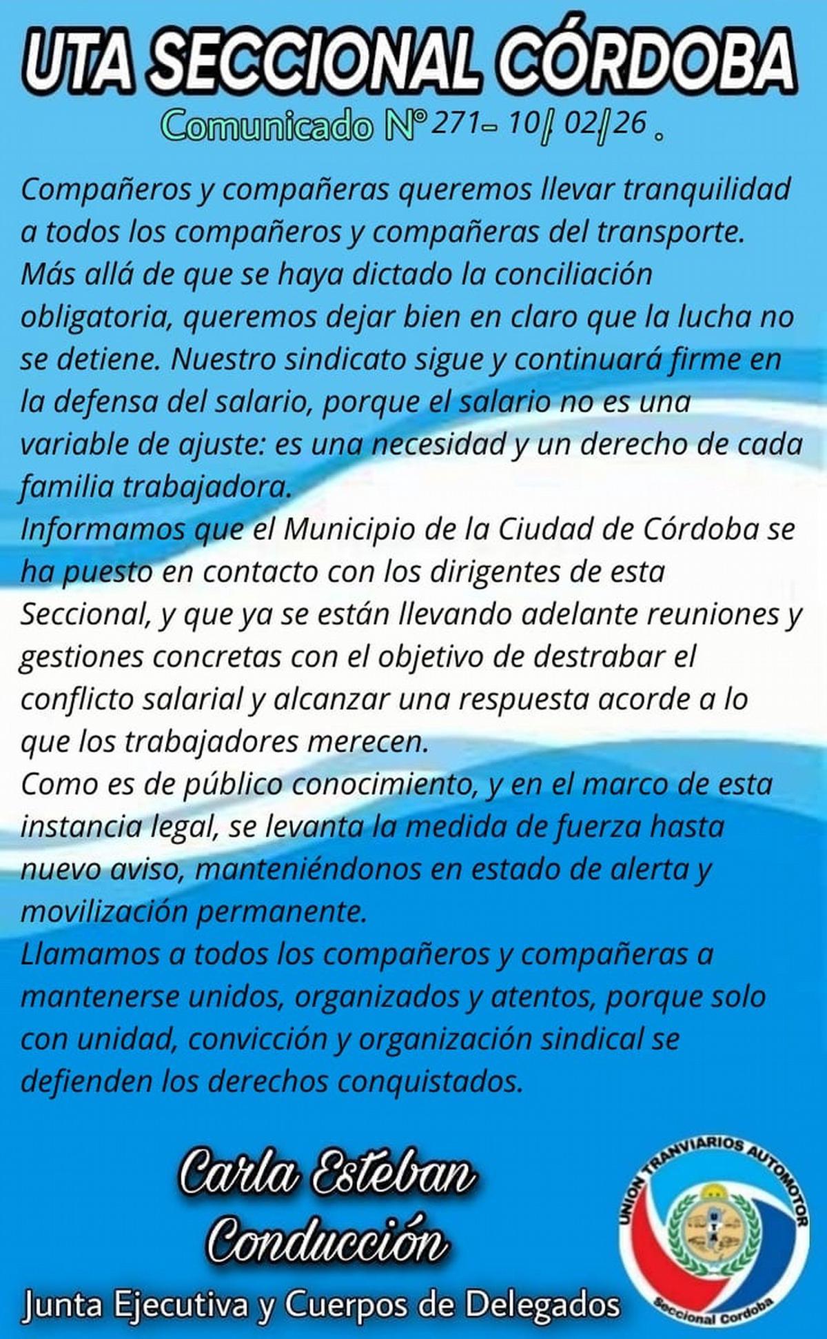 “El Ministerio de Capital Humano, a través de la Secretaría de Trabajo, Empleo y Seguridad Social, informa que se ha dictado la conciliación obligatoria en el conflicto salarial entre la Unión Tranviarios Automotor (UTA) y la Federación Argentina de Transportadores por Automotor de Pasajeros (FATAP)”, señaló el comunicado oficial.