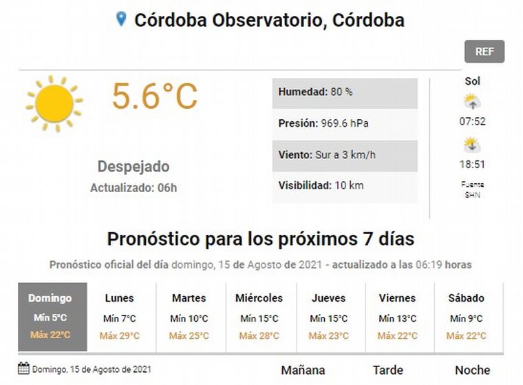 El Servicio Meteorológico Nacional pronosticó para este domingo una jornada con tiempo bueno y una máxima de 23°.