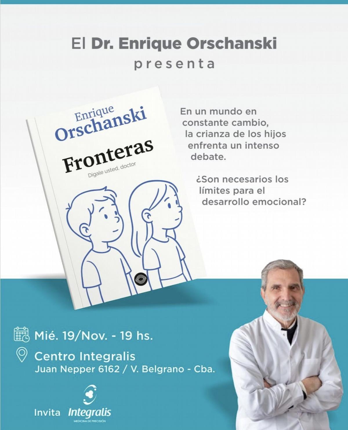 El Dr. Enrique Orschanski presentará su nuevo libro, "Fronteras. Dígale usted, doctor", en una actividad abierta que se realizará el miércoles 19 de noviembre a las 19 en el Centro Integralis, ubicado en Juan Nepper 6162, en el barrio Villa Belgrano de la ciudad de Córdoba.