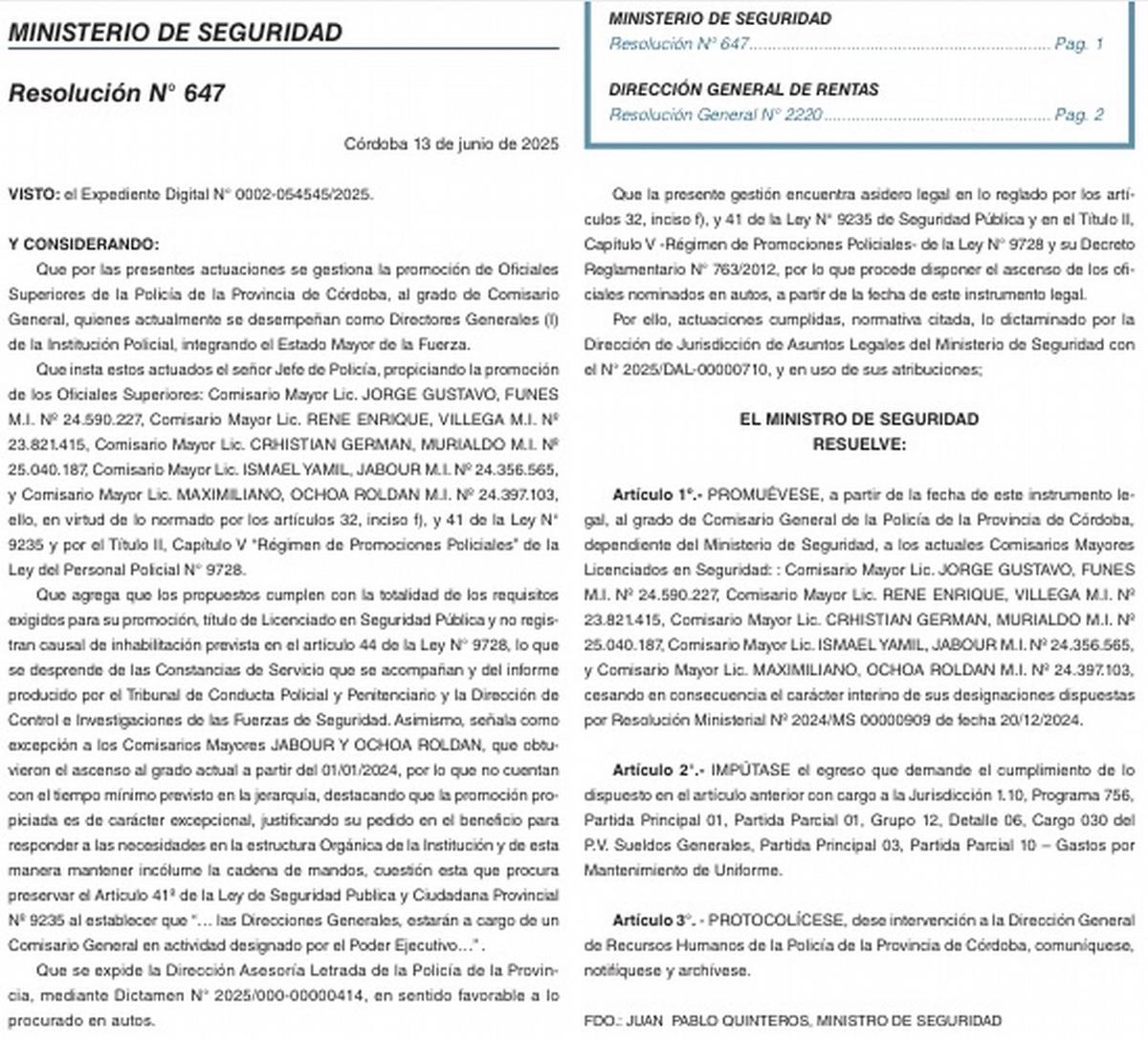 Cabe destacar que el Ministerio de Seguridad de Córdoba, cartera que tiene que decretar los ascensos, había firmado la máxima jerarquía para Ochoa Roldán, en carácter de “excepcional”, ya que no contaba con la antigüedad requerida, el 13 de junio de este año, sólo 14 días antes de su detención.