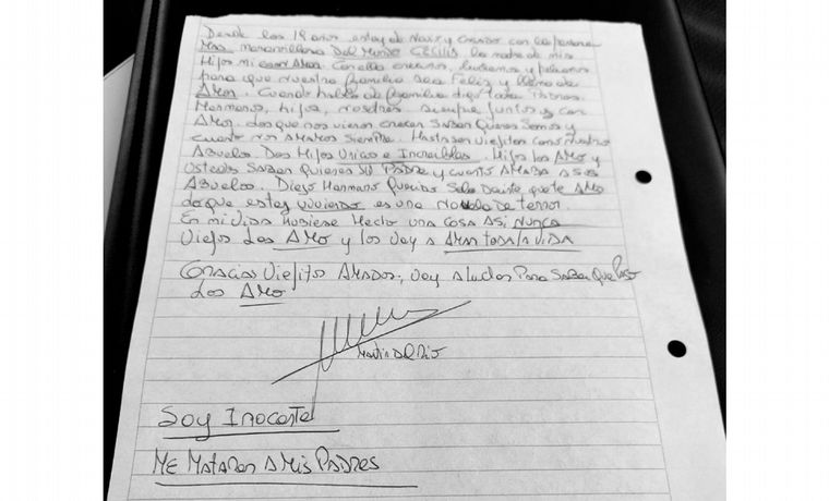 "Hola, soy Martín Santiago del Río. Lo primero que quiero decir es que soy inocente. Me mataron a mis padres. Amé, amo y amaré toda mi vida a mis padres, Quique y Mecha. Fueron las personas que me criaron, me cuidaron siempre en las buenas y en las malas", arrancó el escrito el apresado por los homicidios de José Enrique del Río y María Mercedes Alonso, ocurrido el pasado 24 de agosto.
