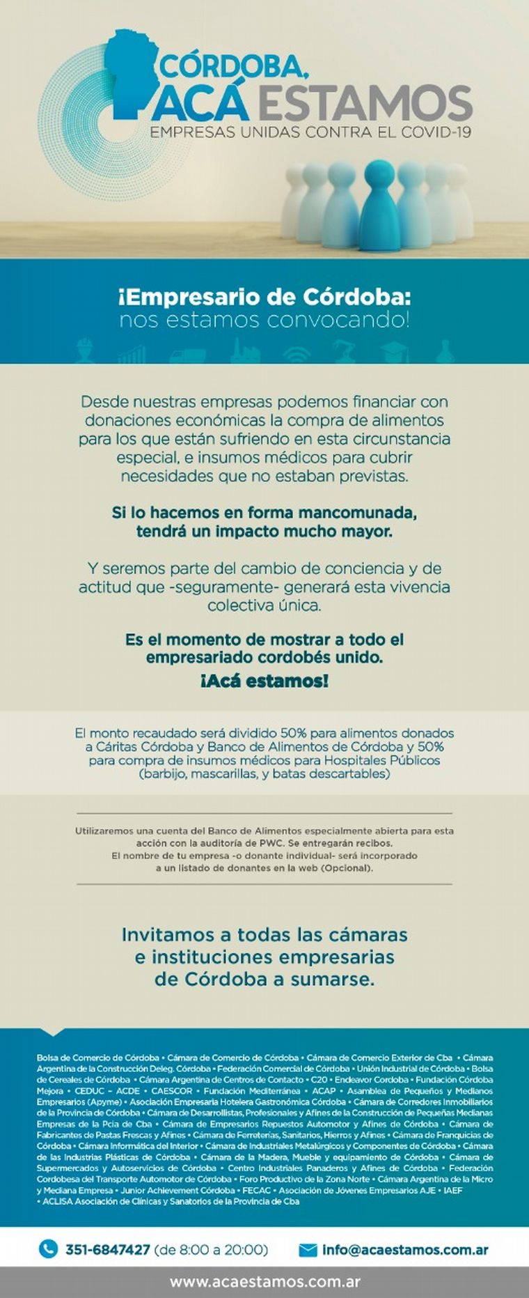 Empresarios de Córdoba se unieron bajo el lema "Acá estamos" para realizar donaciones económicas ante el avance del coronavirus.