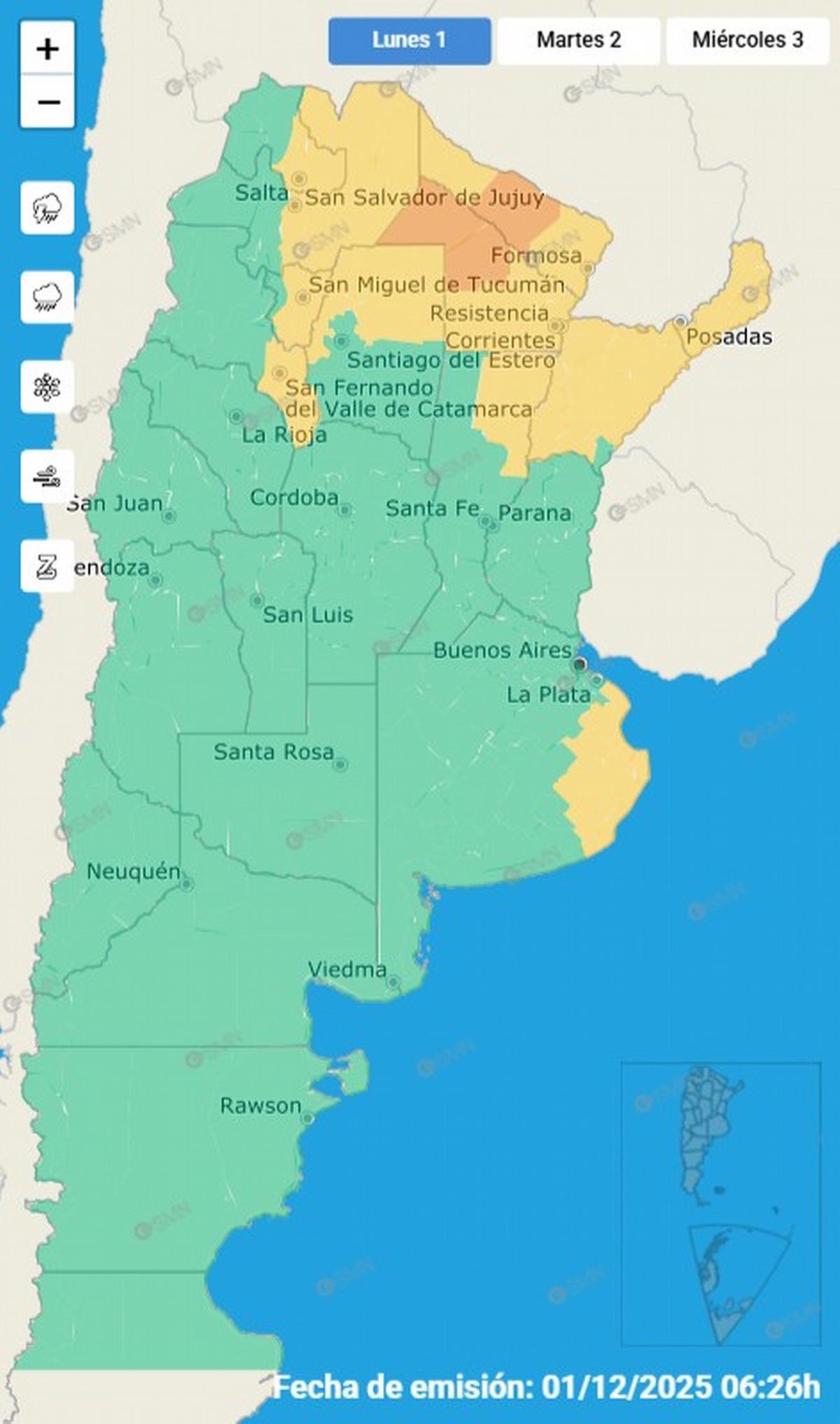 Las alertas fueron emitidas por el Servicio Meteorológico Nacional (SMN).