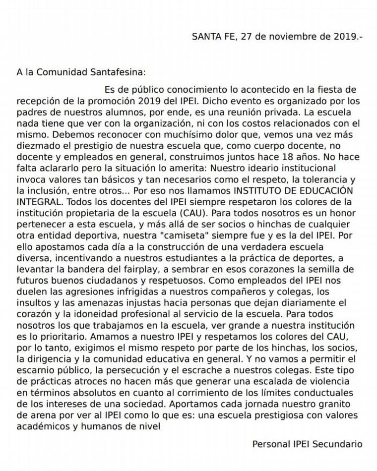 En tanto que el personal del colegio secundario se desligó de la organización de la fiesta ya que aseguraron que se trató de un evento privado, y ratificaron su compromiso con el club Unión.