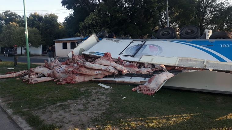 Un camión que transportaba 12 toneladas de carne volcó esta mañana, esparciendo toda su carga, en el ingreso sur a la localidad de Mina Clavero, en Traslasierra.