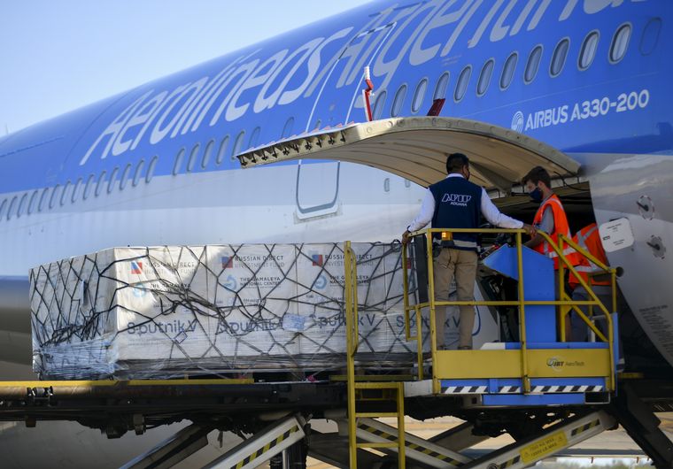 El domingo al mediodía arribaron casi 500 mil vacunas Sputnik V. Un problema logístico obligó a reprogramar la salida del vuelo, a los fines de sumar a las bodegas de la aeronave la mayor cantidad posible-