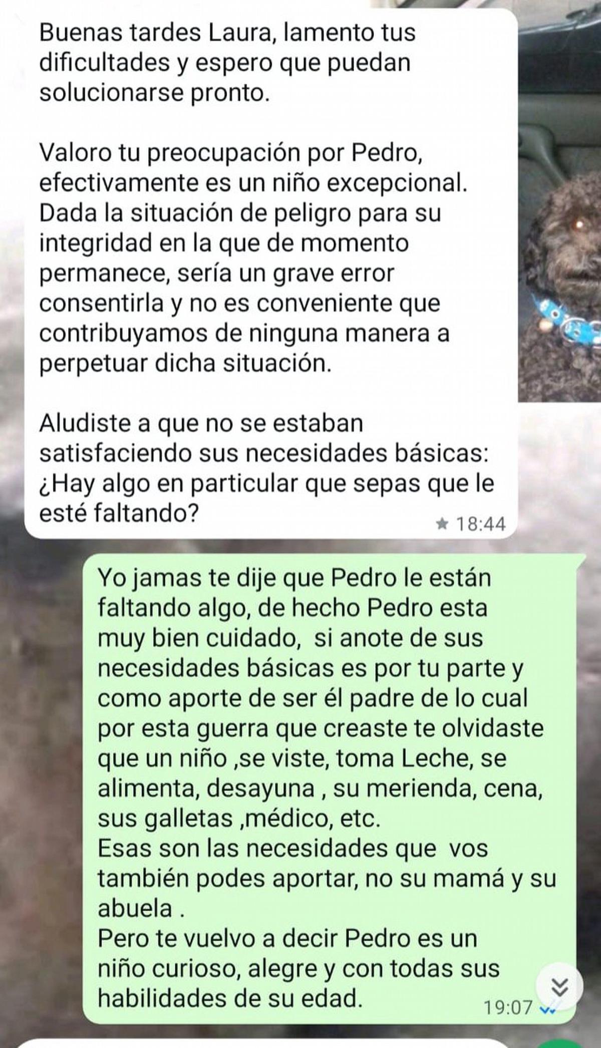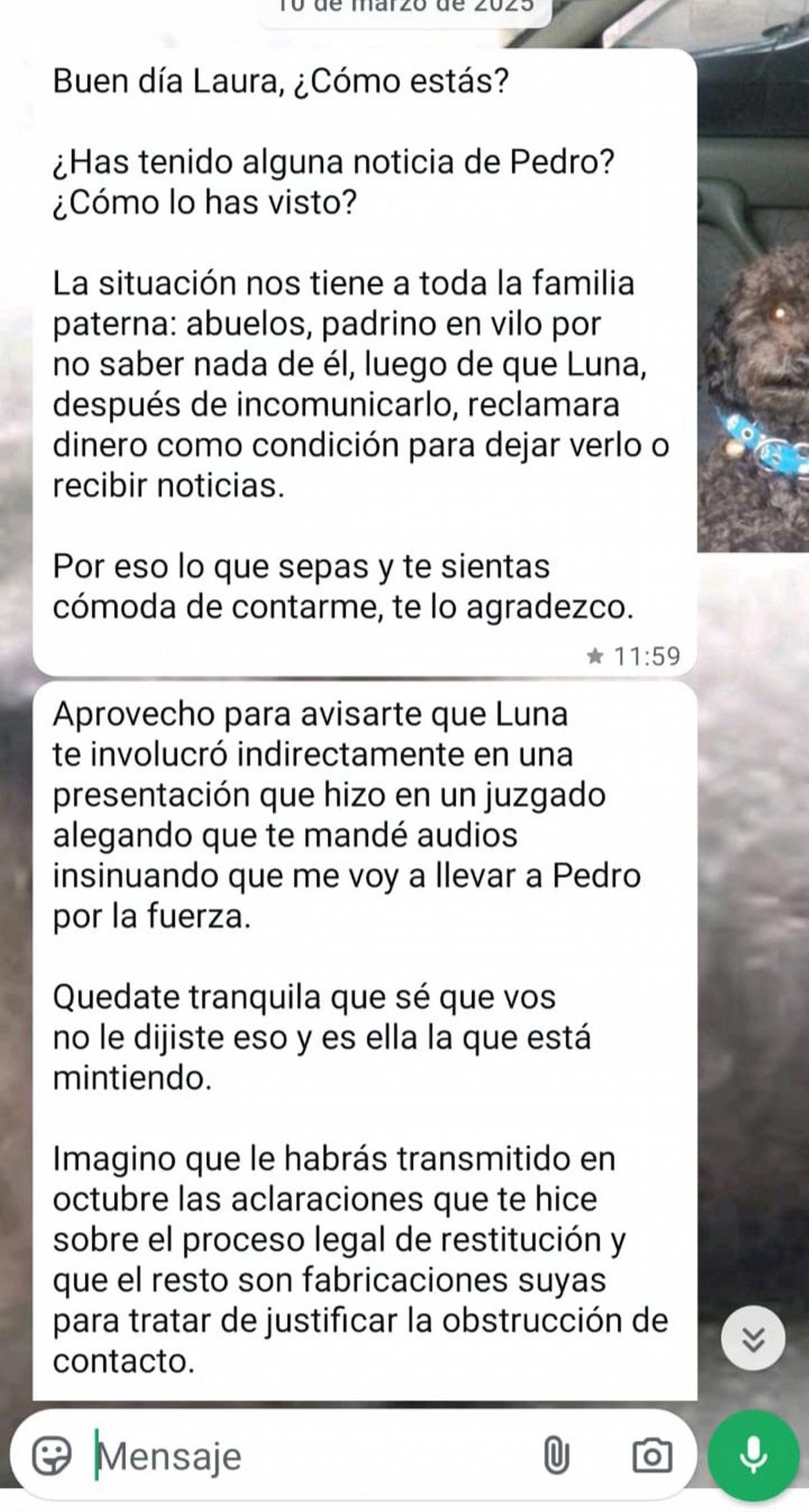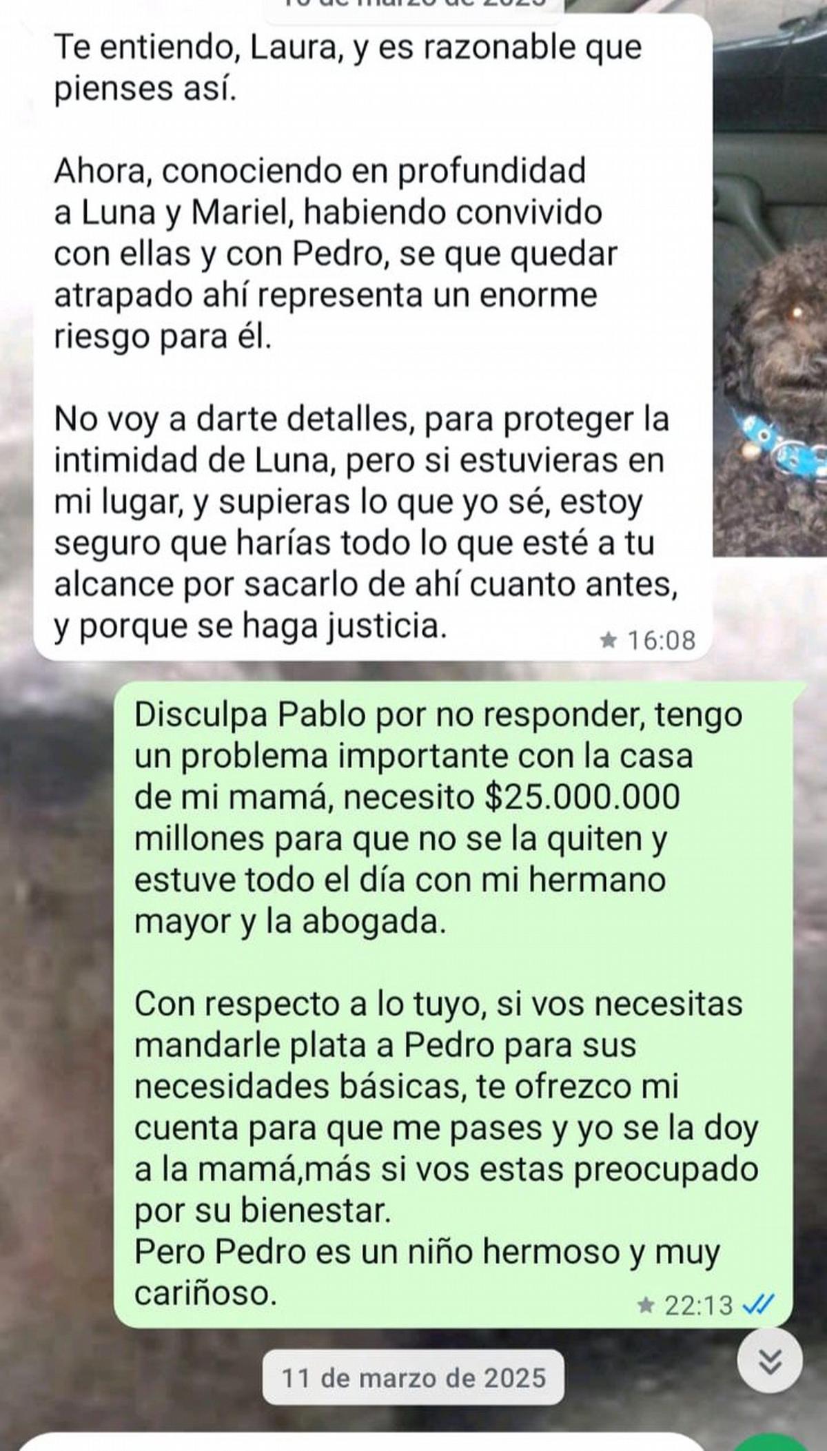 "Por acá estamos todos pendientes y obviamente que dispuestos a lo mejor con respecto a él. Luna tiene que entender que es un miembro de nuestra familia y por eso luchamos por él. No es una fuente personal de ingresos y no lo debe tratar así", dice uno de los últimos mensajes.