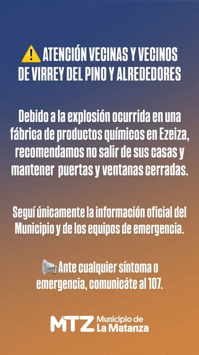 El Municipio de La Matanza emitió este viernes por la noche una alerta sanitaria y preventiva dirigida a los vecinos de Virrey del Pino y zonas cercanas, luego de la fuerte explosión registrada en una fábrica de productos químicos en el partido de Ezeiza, que generó una extensa nube de humo visible desde varios kilómetros.