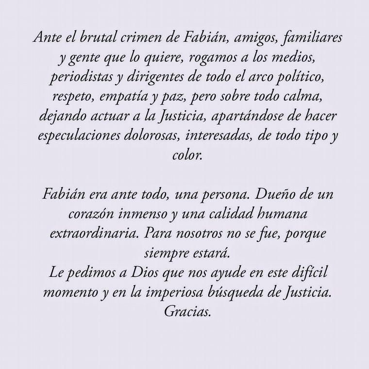 "Ante el brutal crimen de Fabián, amigos familiares y gente que lo quiere rogamos a los medios, periodistas y dirigentes de todo el arco político respeto, empatía y paz, pero sobre todo calma, dejando actuar a la Justicia", expresaron mediante un escrito difundido por las redes sociales.
