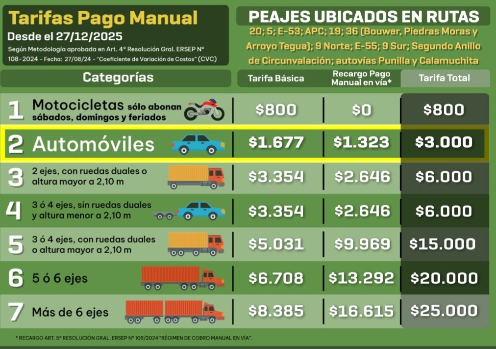 Sube el peaje en Córdoba: el pago manual costará $3.000 desde el 27 diciembre